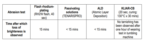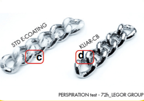 Perspiration Most jewellery which is unprotected after 72 hours will mark the jewellery and furthermore over time will discolour the jewellery, in particular sterling silver from our experience, tarnishes easily and also marks the skin. nThe test conducted by Legor laboratory confirms the performance over traditioanl other e coatings.